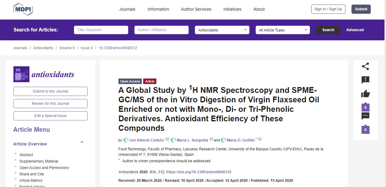 Tên nghiên cứu : Một nghiên cứu toàn cầu bằng phương pháp quang phổ H NMR và SPME-GC / MS của quá trình tiêu hóa in vitro của dầu hạt lanh giàu hoặc không có dẫn xuất Mono-, Di- hoặc Tri-Phenolic. Hiệu quả chống oxy hóa của các hợp chất này.