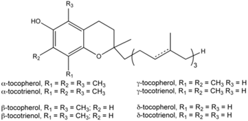 Vitamin E tự nhiên tồn tại dưới 8 dạng khác nhau, trong đó có 4 tocopherol và 4 tocotrienol. Tất cả đều có vòng chromanol, với nhóm hydroxyl có thể cung cấp nguyên tử hydro để khử các gốc tự do và nhóm R (phần còn lại của phân tử) sợ nước để cho phép thâm nhập vào các màng sinh học. Các tocopherol và tocotrienol đều có dạng alpha, beta, gamma và delta, được xác định theo số lượng và vị trí của các nhóm metyl trên vòng chromanol. Mỗi dạng có hoạt động sinh học hơi khác nhau.
